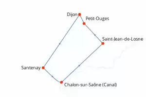 Itinerário : Dijon, Saint-Leger-sur-Dheune, Santenay, , Chalon sur saone (Cana)l, Saint-Jean-de-Losne, Petit-Ouges, Dijon