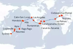 Itinerário : Sydney, Noumea, Luganville, Apia, Pago Pago, Honolulu, Hilo, Los Angeles, Cabo San Lucas, Puntarenas, Canal panama (Enter), Canal do Panamá, Ocho Rios, Road Town, Philippsburg, Las Palmas, Palma de Maiorca, Napoles, Civitavecchia (Roma)