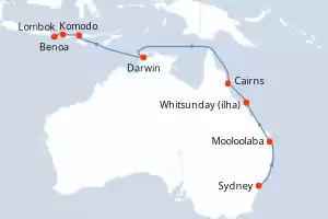 Itinerário : Sydney, Mooloolaba, Whitsunday (ilha), Townsville, Cairns, Darwin, Kupang, Timor Oriental, Komodo, Benoa, Surabaya, Singapura
