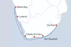 Itinerário : Cidade do Cabo, Luderitz, Walvis Bay, Port Elizabeth, Durban, Baia Mossel, Cidade do Cabo