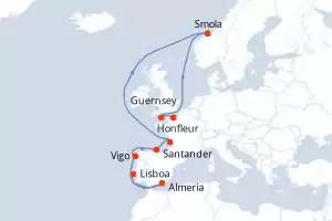 Itinerário : Lisboa, Almeria, Vigo, Santander, Bordeaux, Smola, Guernsey, Honfleur