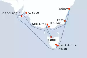 Itinerário : Sydney, Ilha Philip, Melbourne, Burnie, Adelaide, Ilha do Canguru, Hobart, Porto Arthur, Eden, Sydney