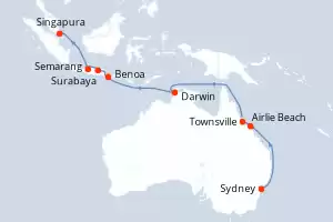 Itinerário : Sydney, Airlie Beach, Townsville, Darwin, Benoa, Surabaya, Semarang, Singapura
