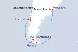 Itinerário : Buenos Aires, Montevideu, Puerto Argentino, Ushuaia, Punta Arenas, Glaciar Pio X, Puerto Montt, San antonio Chili