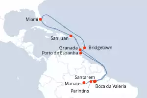 Itinerário : Miami, Bridgetown, Porto de Espanha, Santarem, Boca da Valeria, Manaus, Parintins, Alter do Chao, Granada, San Juan, Miami