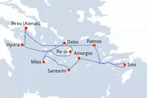 Itinerário : Pireu (Atenas), Patmos, Simi, Amorgos, Santorini, Milos, Delos, Paros, Hydra, Pireu (Atenas)