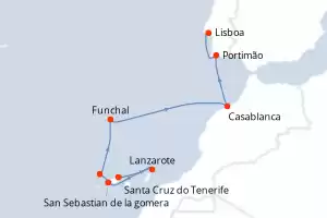 Itinerário : Santa Cruz do Tenerife, Lanzarote, San Sebastian de la gomera, Santa Cruz de la Palma, Funchal, Casablanca, Portimão, Lisboa