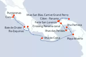 Itinerário : Cólon, Fuerte San Lorenzo, Ilhas San Blas, Carti et Grand Perro, Crossing Panama canal, Ilhas das Perolas, Pacheca Island, Playa Muerto, Ilha de Coiba, Rio Esquinas, Baie de Drake, Curu, Puntarenas