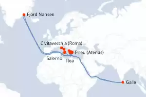 Itinerário : Civitavecchia (Roma), Salerno, Reggio Calabria, Catânia, Galle, Parga, Katakolon / Olimpia, Canal de Corinto, Itea, Fjord Nansen , Hydra, Pireu (Atenas)