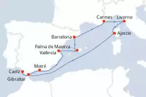 Itinerário : Barcelona, Palma de Maiorca, Valência, Motril, Cadiz, Gibraltar, Ajaccio, Livorno, Cannes, Barcelona