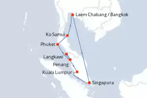 Itinerário : Singapura, Phu My, Sihanoukville, Laem Chabang / Bangkok, Ko Samui, Langkawi, Phuket, Penang, Kuala Lumpur, Singapura