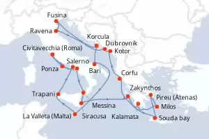 Itinerário : Civitavecchia (Roma), Ponza, Salerno, Messina, Siracusa, Zakynthos, Souda bay, , Pireu (Atenas), Milos, Kalamata, Corfu, Kotor, Dubrovnik, Fusina, Ravena, Korcula, Bari, La Valleta (Malta), Trapani, Napoles, Civitavecchia (Roma)