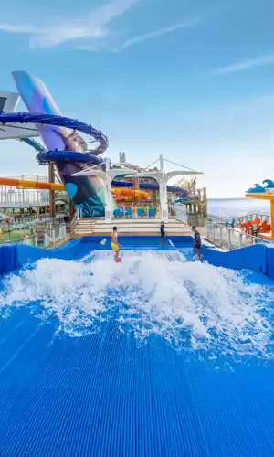 Lançado em 2024, o Icon of the Seas inaugura a classe Icon e eleva os limites do entretenimento familiar no mar. O Category 6, um gigantesco parque aquático do distrito Thrill Island, possui seis escorregadores revolucionários, incluindo o Frightening Bolt, um dos mais altos já vistos no mar, e o Pressure Drop, o primeiro escorregador de queda livre aberto em um navio de cruzeiro. A atração Crown's Edge, uma mistura de percurso de cordas e passarela Skywalk, o simulador de surf FlowRider e a parede de escalada Adrenaline Peak são apenas alguns exemplos das muitas atividades divertidas no Icon of the Seas. Em termos de alimentação, o Icon of the Seas impressiona com mais de 40 restaurantes, bares e lounges. O Izumi, localizado no distrito de Central Park, oferece deliciosos sushis ao ar livre. O Lime and Coconut, em três andares, proporciona uma experiência elegante e exótica de bar com vistas deslumbrantes e uma ampla seleção de coquetéis.