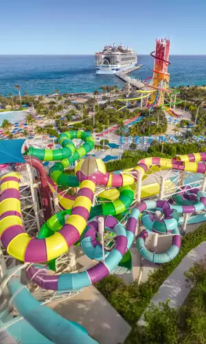 As Bahamas são famosas por suas longas praias de areia fina e suas águas cristalinas. Muitos cruzeiros nas Bahamas partem do porto de Miami e fazem escala na ilha privada da Royal Caribbean, Perfect Day at CocoCay. É um destino desenhado para agradar a todos, de famílias a casais em busca de tranquilidade. Na agenda: o Thrill Waterpark, equipado com o mais alto escorregador aquático da América do Norte, a possibilidade de alugar cabanas privadas, experiências fascinantes de snorkeling, bem como a chance de sobrevoar a ilha de tirolesa ou balão de ar quente, oferecendo vistas panorâmicas de tirar o fôlego.