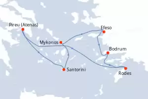 Itinerário : Pireu (Atenas), Mykonos, Santorini, Efeso, Bodrum, Rodes, Pireu (Atenas)