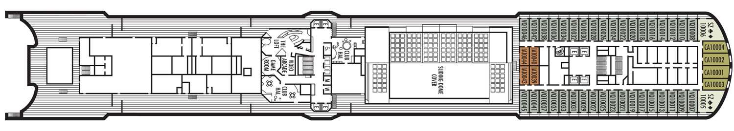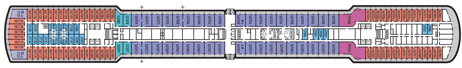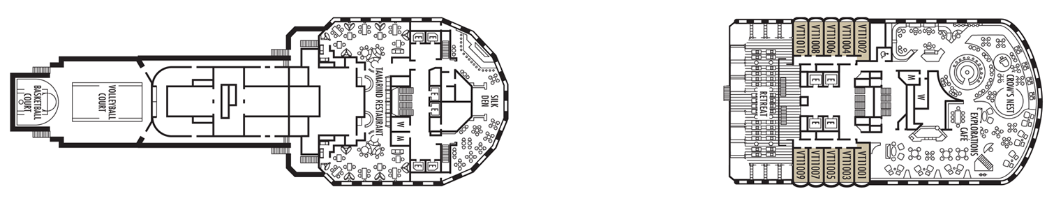 Duas camas individuais conversíveis em cama queen-size, banheira e chuveiro. Aproximadamente 169 - 267 pés quadrados. Nota: Esta categoria possui mais de um tipo de vista. Essa Cabine possui: Luxuosas camas com colchões Sealy ® Premium Euro-Top e finos lençóis de algodão. Roupões Deluxe e felpudos para uso durante sua viagem. Toalhas de algodão 100% Egípcio. Chuveiros Premium. Espelhos de maquiagem com ampliação 5X e secadores de cabelo com qualidade de salão de beleza. Sabonetes perfumados, loções, shampoo e outros produtos de banho Elemis Aromapure. Cortesia de frutas frescas mediante pedido. Elegante balde de gelo e bandeja para bebidas na cabine. TV de tela plana e DVD player. Serviços de quarto para Gelo, serviço de engraxar sapatos e serviço de abertura de cama. Nota - Alguns quartos da mesma categoria podem apresentar diferentes configurações e/ou instalações. As dimensões dos quartos são aproximadas. Por favor, confirme antes de agendar sua viagem.