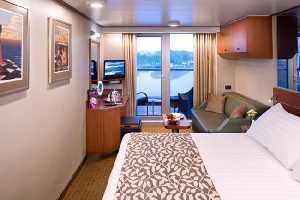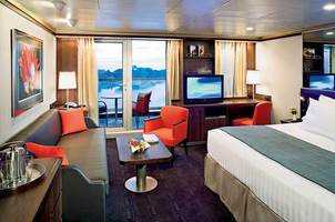 Duas camas conversíveis em cama queen-size, banheira, chuveiro,área de estar, Varanda privativa, Janelas do piso ao teto. Aproximadamente 213 - 379 pés quadrados, incluindo varanda. Essa Cabine possui: Nossa distinta cama Mariner´s Dream? com colchões Sealy Posturepedic® Euro-Top e lençóis de algodão finos. Luxuosos roupões de banho para uso durante sua viagem. Toalhas de algodão 100% Egípcio. Chuveiros de massagem Premium. Espelhos de maquiagem com ampliação 5X e secadores de cabelo com qualidade de salão de beleza. Sabonetes perfumados, loções, shampoo e outros produtos de banho Elemis Aromapure. Cortesia de frutas frescas a seu pedido. Elegante balde de gelo e bandeja para bebidas na cabina. TV de tela plana e DVD player. Serviços de quarto para Gelo, engraxar sapatos e serviço de abertura de cama. Nota - Alguns quartos da mesma categoria podem apresentar diferentes configurações e/ou instalações. As dimensões dos quartos são aproximadas. Por favor, confirme antes de agendar sua viagem