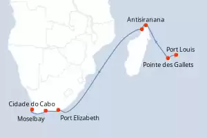 Itinerário : Port Louis, Pointe des Gallets, Nosy Be, Durban, Port Elizabeth, Baia Mossel, Cidade do Cabo