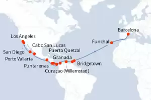 Itinerário : Barcelona, Funchal, Bridgetown, Granada, Curaçao (Willemstad), Cartagena, Puerto Limon, Canal do Panamá, Canal panama (Enter), Puntarenas, Puerto Quetzal, Porto Vallarta, Cabo San Lucas, San Diego, Los Angeles